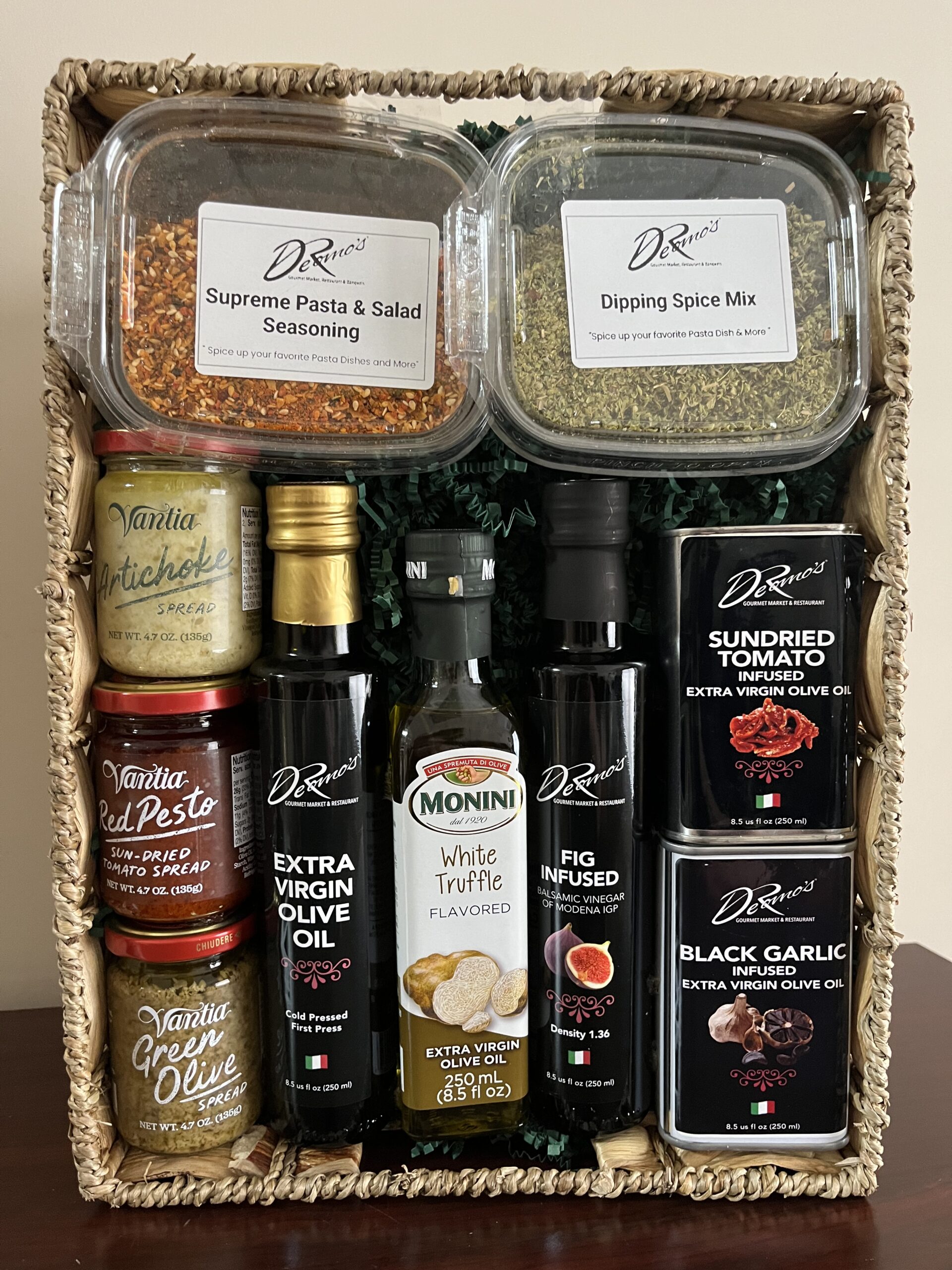Capturing the essence of Italian cooking, our iconic Italian gift basket showcases premium condiments of the highest quality, thoughtfully selected from the esteemed DeRomo’s selection of olive oils, spice blends, balsamic and Italian spreads for crackers, sandwiches and even pasta. Buon Appetito!